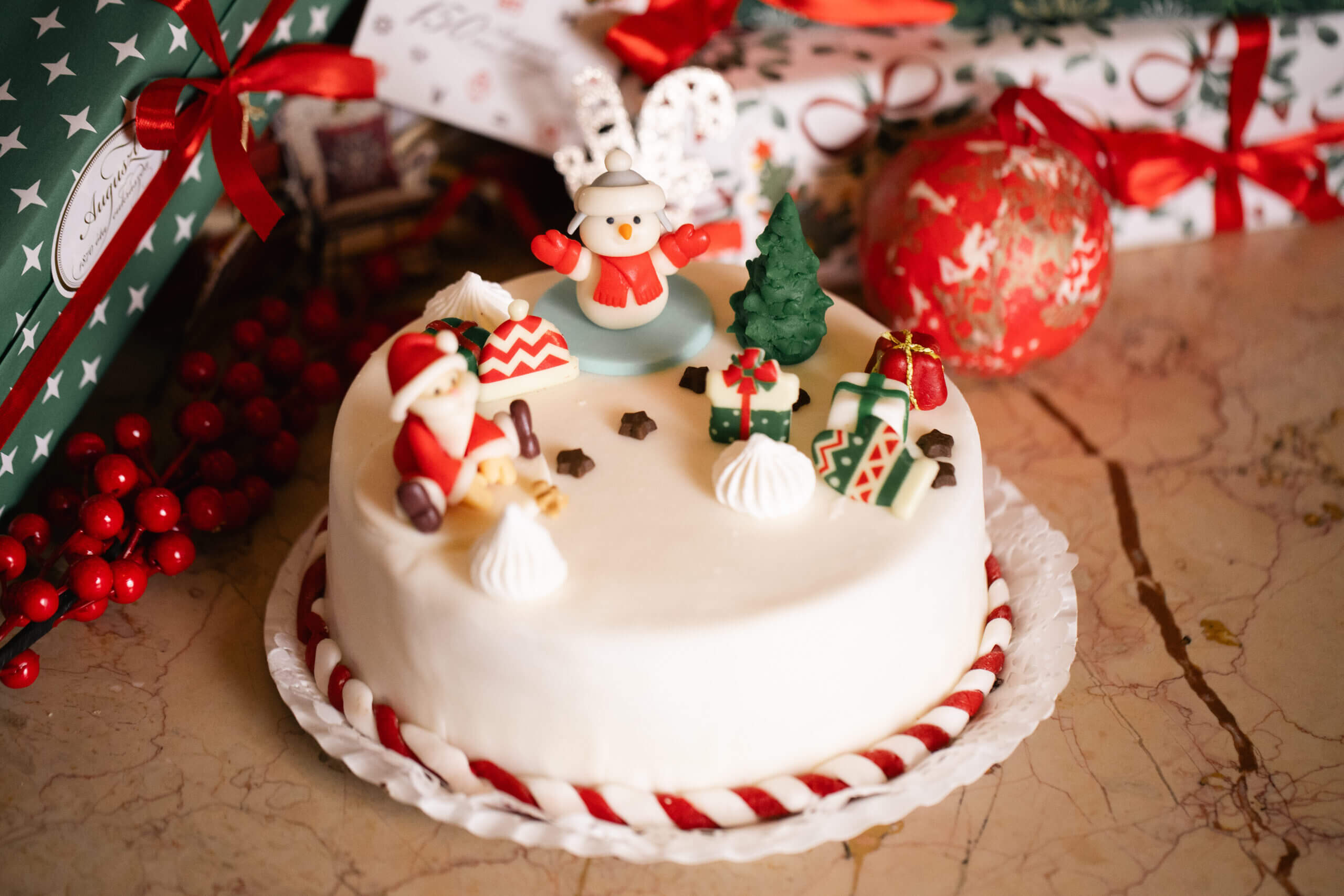 10 szeletes csokoládé torta, csokoládés piskóta, főzött csokoládékrém, burkolás, karácsonyi díszek