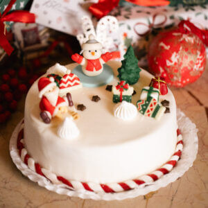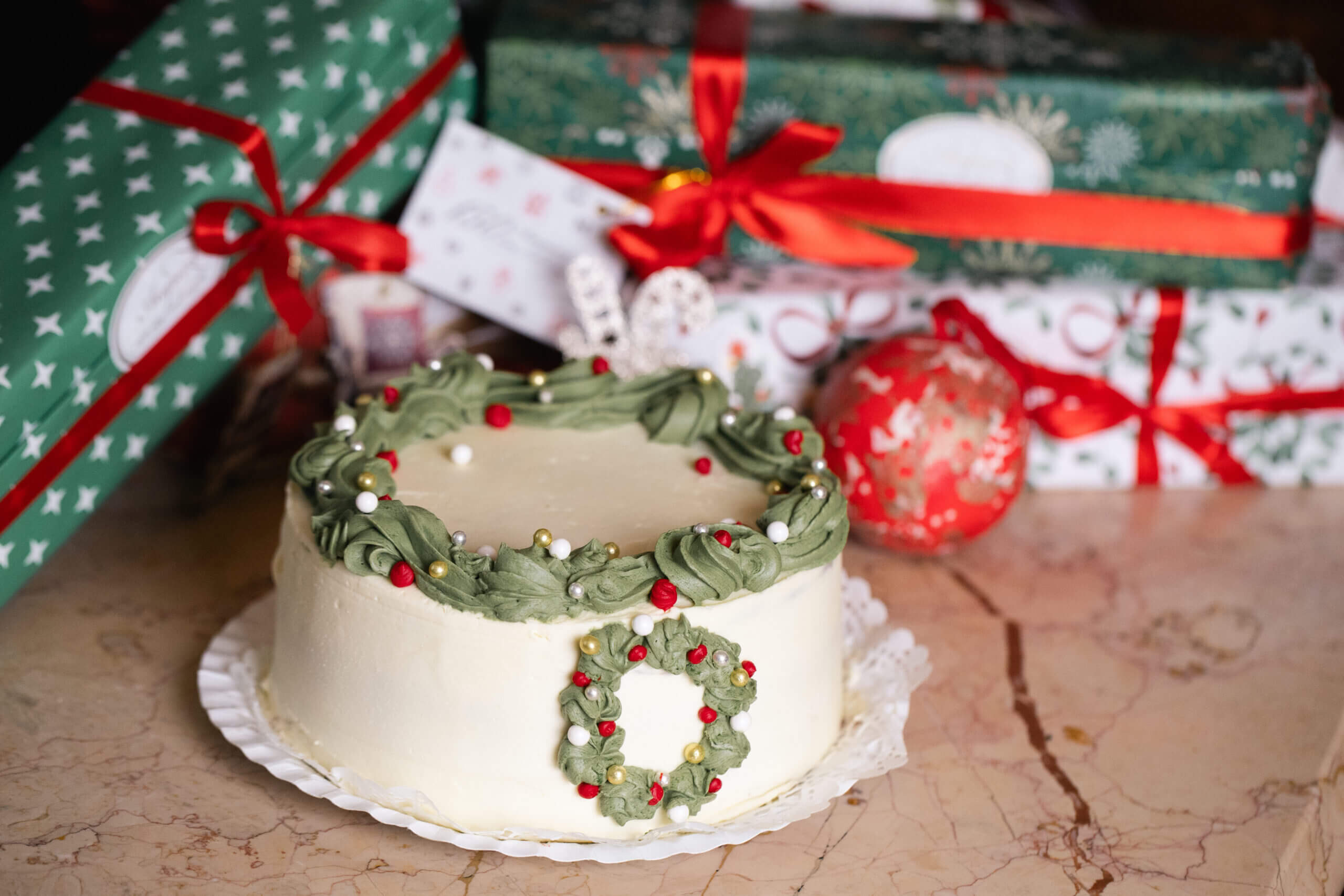 10 szeletes gyömbér torta, koszorú díszítéssel. (Gyömbéres piskóta, főzött vaníliakrém őszibarack darabokkal, burkolás, tejcsokoládé krém)
